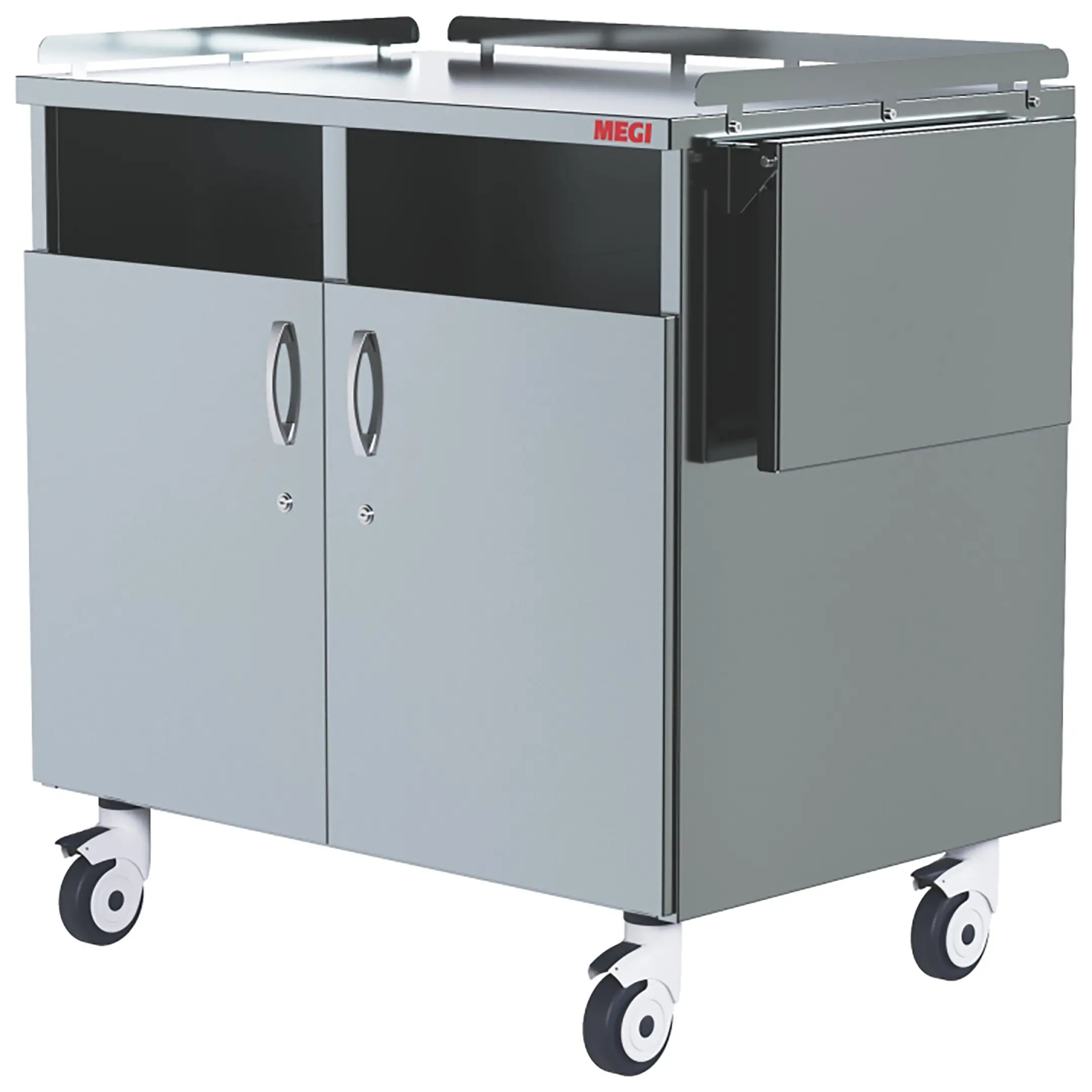 • колеса поворотные, самоориентирующиеся, диаметром 100 мм, комплектуются надёжной стальной вилкой с прецизионным радиально-упорным подшипником, ободом из полипропилена и шинкой из серого полиуретана, не оставляющего следов на полу, два колеса – с индивидуальным тормозным устройством;