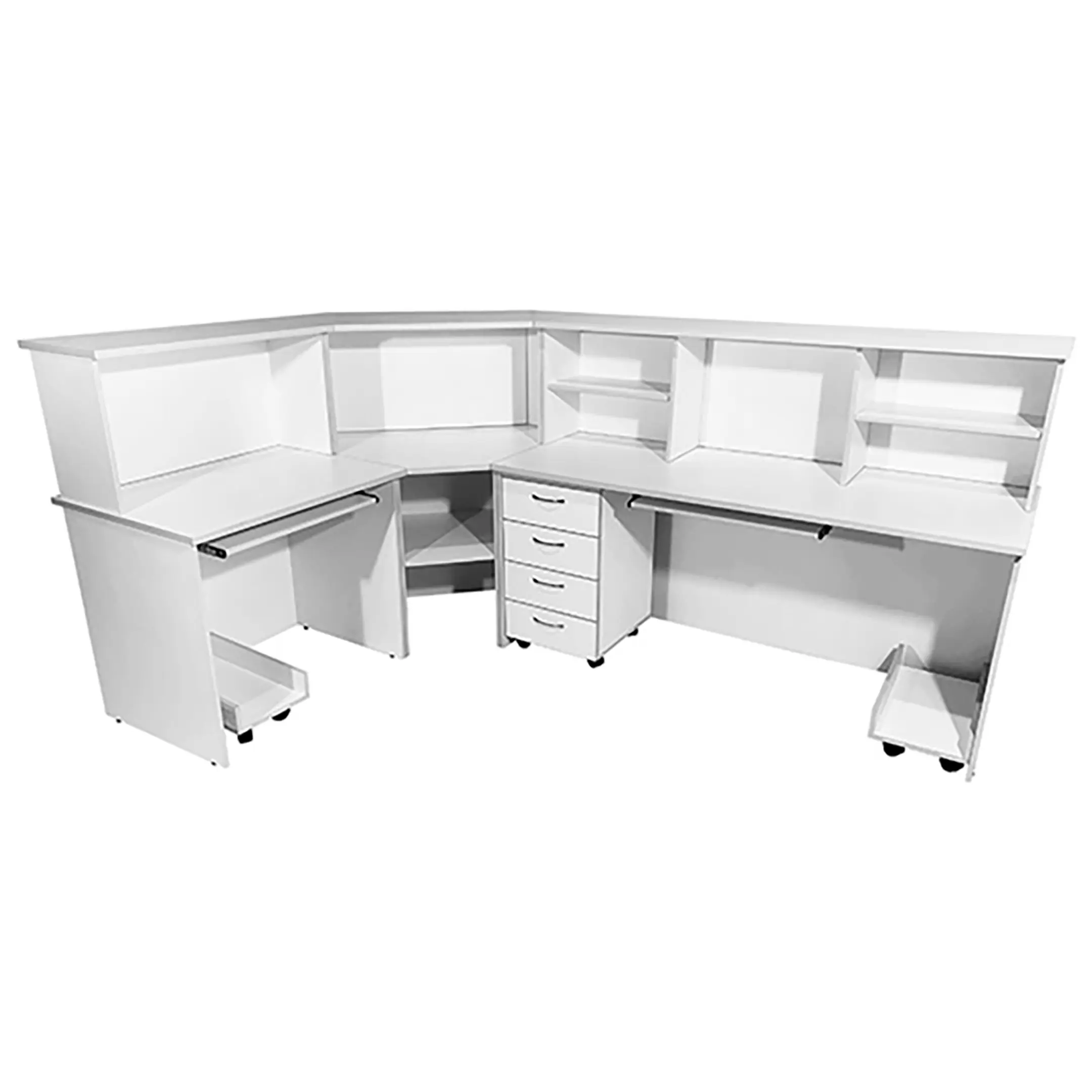 Стол-пост медицинский MD СтП 11.03 (белый) — это надежное и функциональное угловое решение для создания удобного рабочего места администратора в медицинских учреждениях. Модель выполнена из ЛДСП, имеет надстройку с полками, подкатную платформу для системного блока, полки для клавиатуры слева и справа, а также тумбу с четырьмя выдвижными ящиками и дополнительными полками.