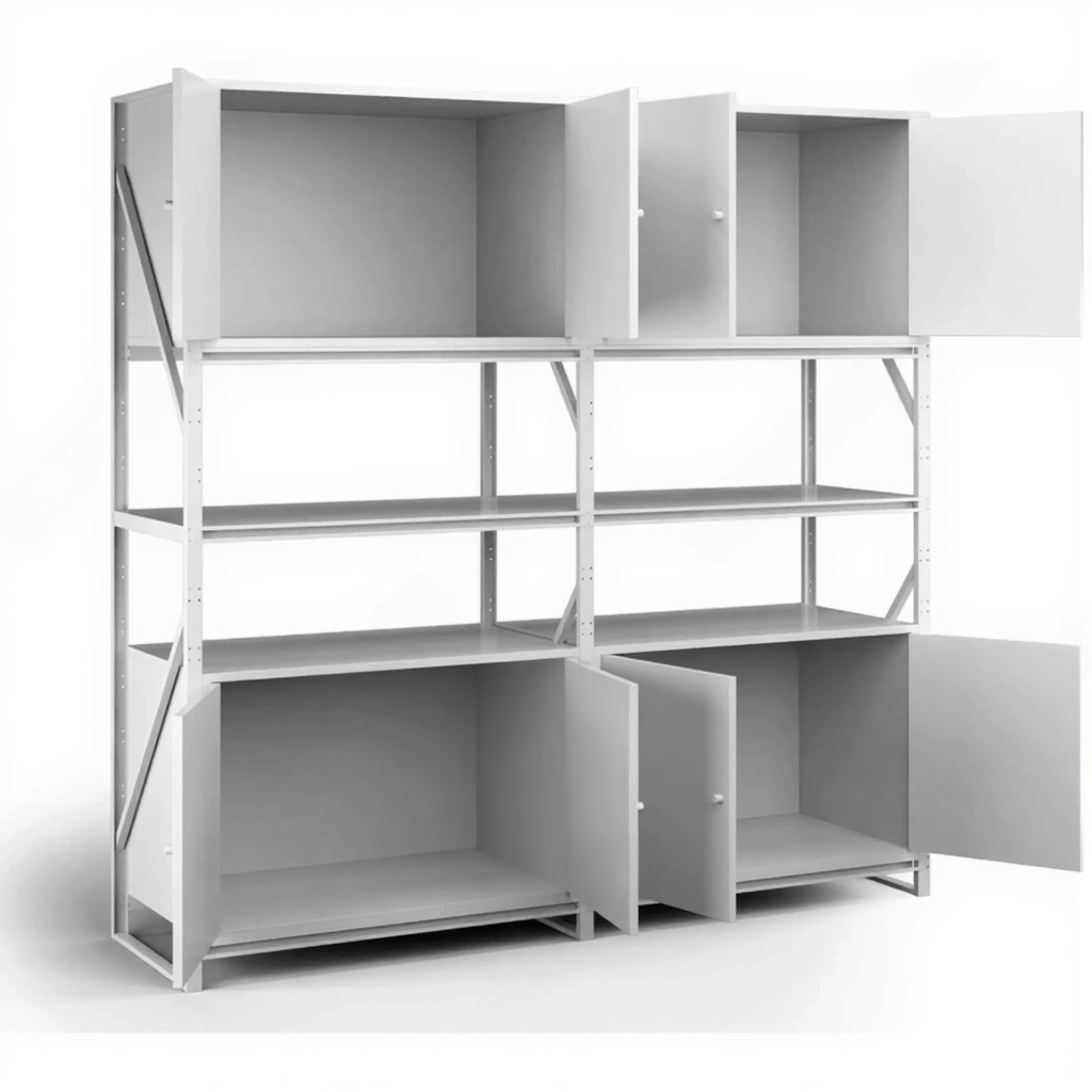 - Многоуровневая система хранения различного инвентаря — конструкция позволяет размещать на нижних и средних ярусах тяжелые и часто используемые предметы (технику, материалы), а на верхних антресолях — более легкие, объемные или архивные вещи (запасы упаковки, сезонный инвентарь, документацию).