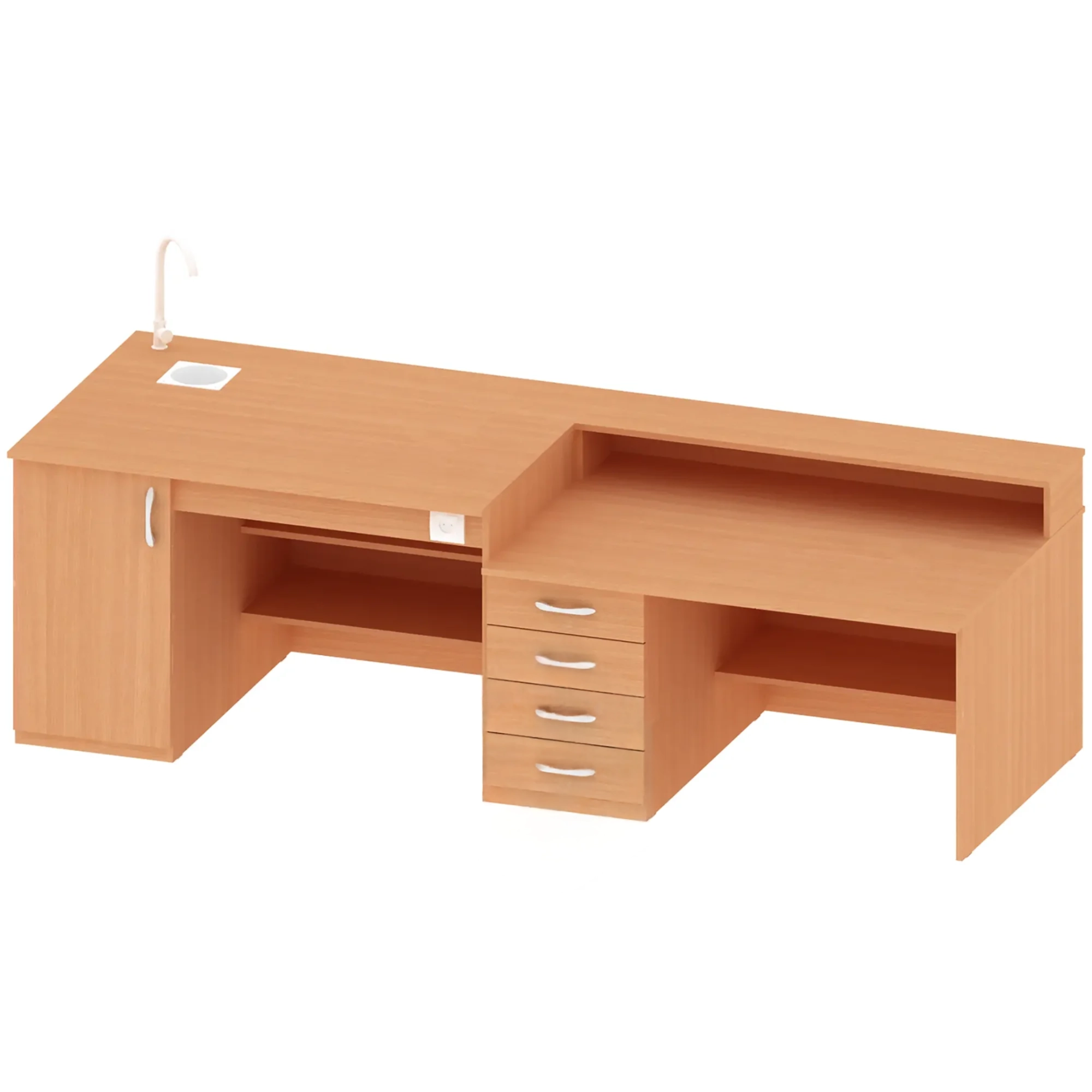 Стол демонстрационный для кабинета химии ПР-ТР-8, Бук Бавария Светлый — это специализированное учебное оборудование, предназначенное для проведения демонстрационных экспериментов и практических занятий по химии в школах и других образовательных учреждениях. Модель имеет комбинированную конструкцию: одна половина предназначена для демонстраций, вторая — приставной стол для работы преподавателя. Стол оснащен тумбой с дверцей, открытой полкой и тремя розетками. Столешница покрыта пластиком. Изготовлен из качественной ЛДСП 16 мм цвета «Бук Бавария Светлый».