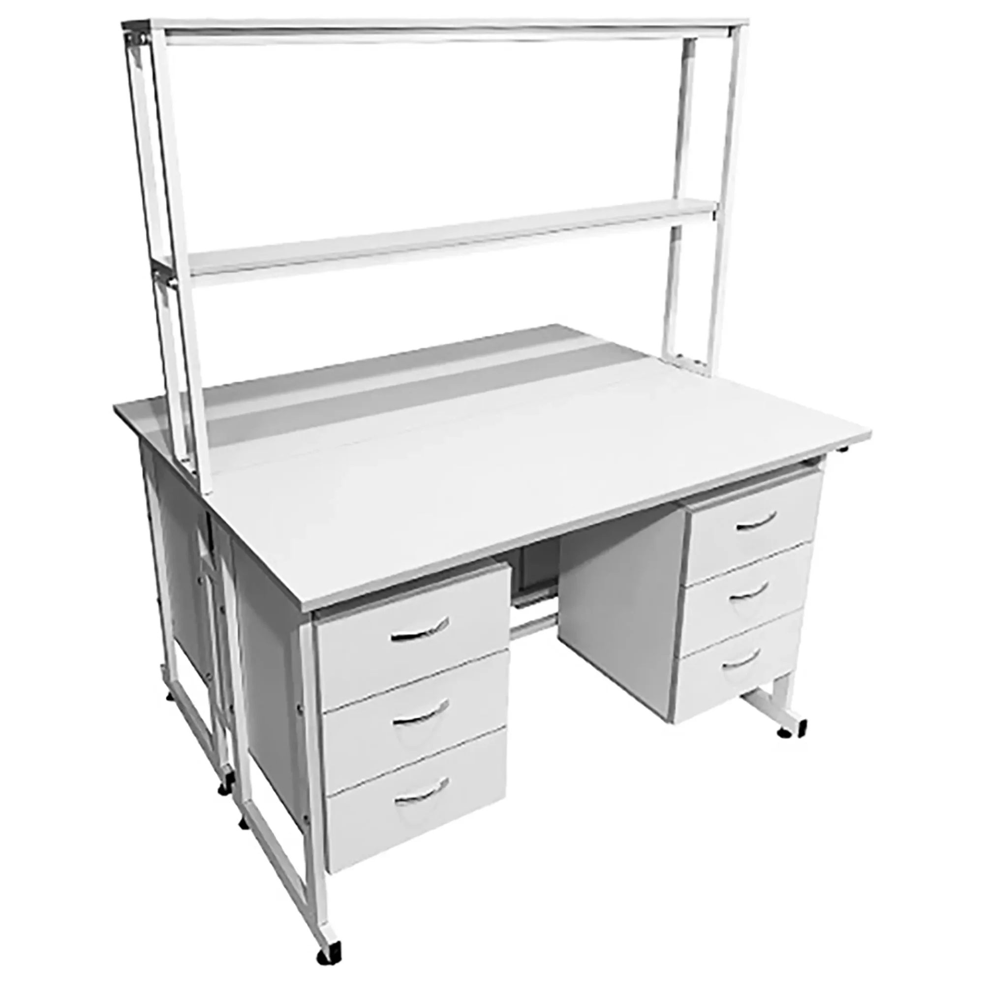 - Вместительная система хранения — четыре подвесные тумбы, каждая с тремя выдвижными ящиками (всего 12 ящиков), для хранения лабораторных принадлежностей.