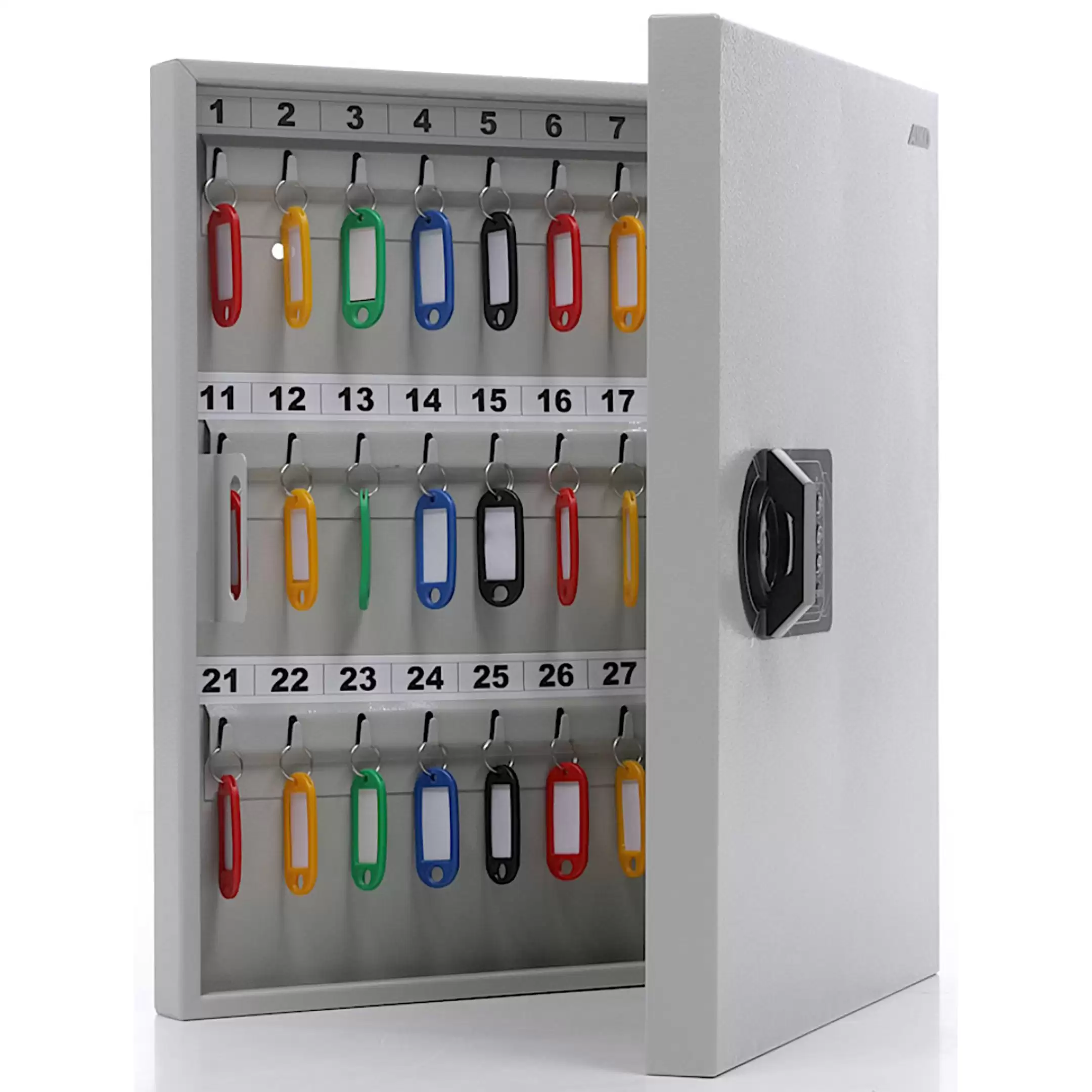 - Четкая систематизация и быстрый поиск — 55 металлических крючков и комплект цветных брелков с самоклеящимися номерками позволяют логично распределить ключи по назначению, категориям или ответственным лицам, что значительно экономит время на их поиск и выдачу.