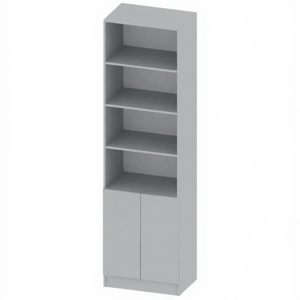 - Полуоткрытая конструкция — сочетание открытых полок для часто используемых материалов и закрытого отсека для хранения документов, требующих защиты.