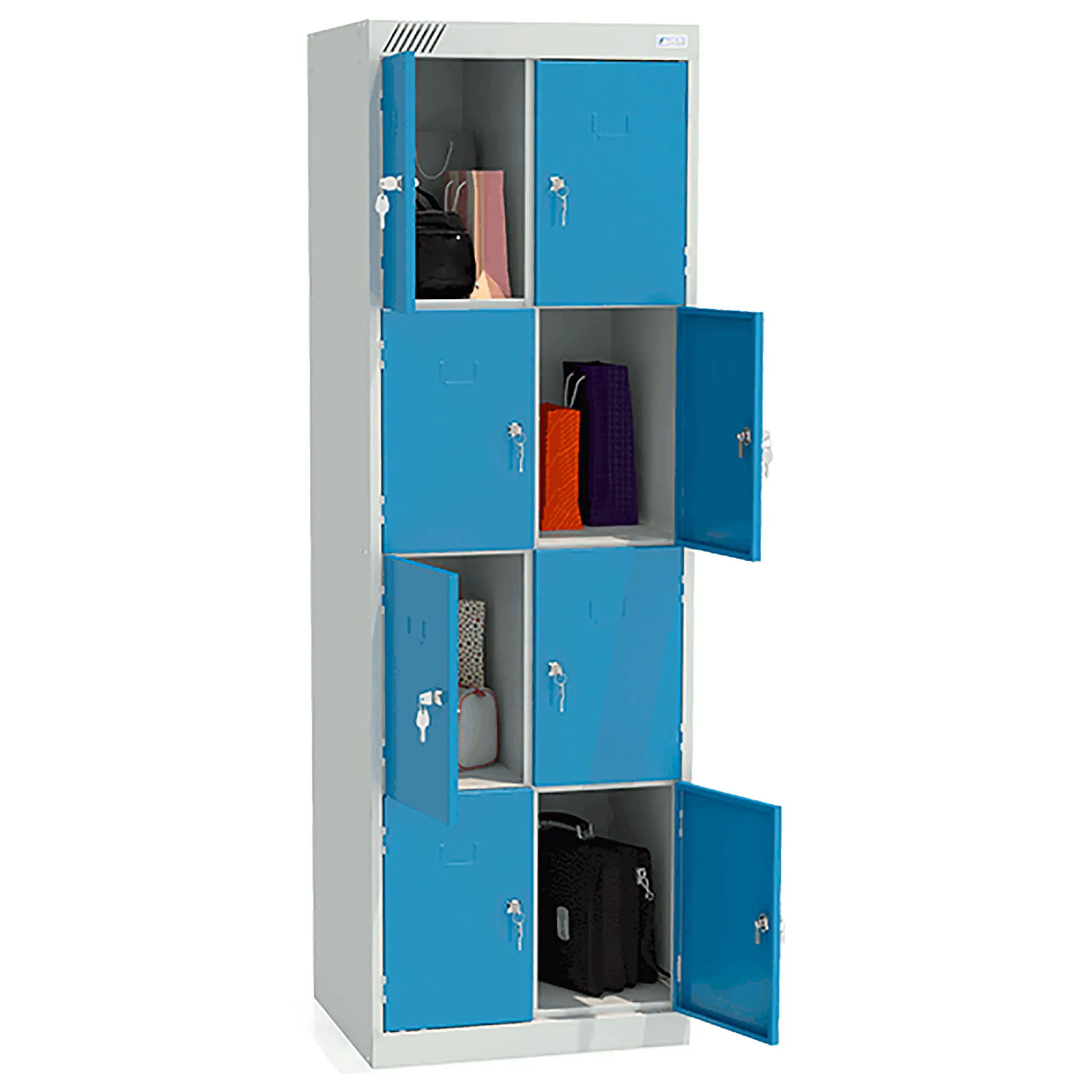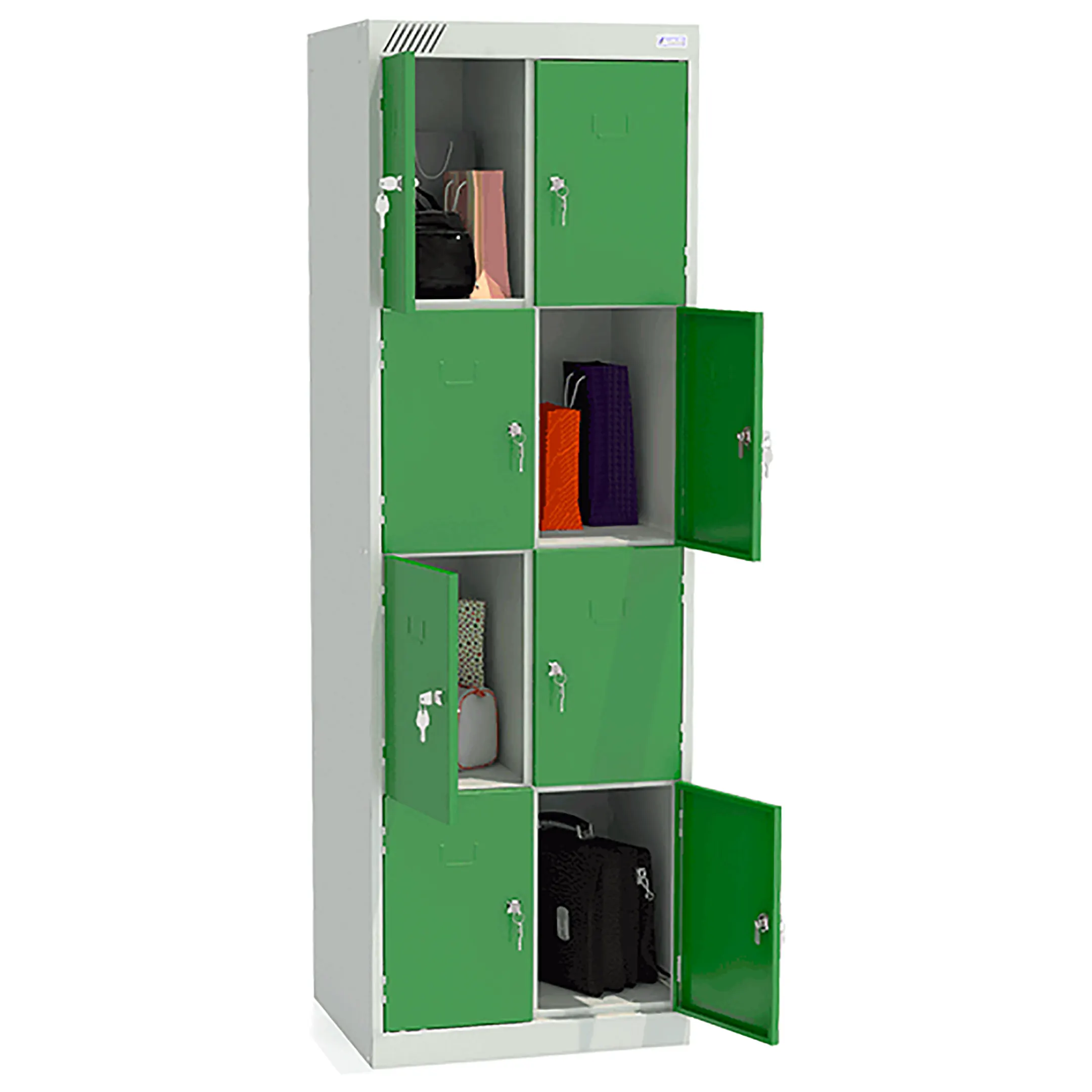 - Вместительная конструкция — две секции и восемь ячеек обеспечивают индивидуальное хранение для нескольких человек.