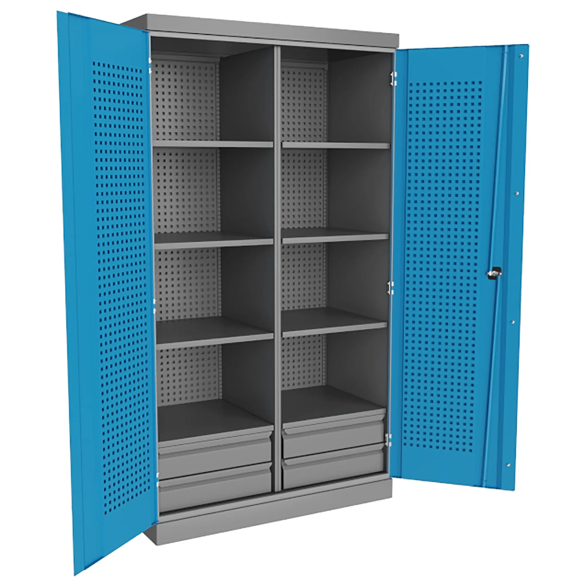 - Специализированное хранение для оснастки ЧПУ — шкаф оснащен специальными держателями, перфорированными панелями с точными креплениями и/или регулируемыми полками, предназначенными для безопасного и компактного размещения фрез, сверл, резцов, цанг, оправок и других элементов режущего инструмента. Каждый инструмент фиксируется в отдельной ячейке, предотвращая контакт и повреждение режущих кромок.