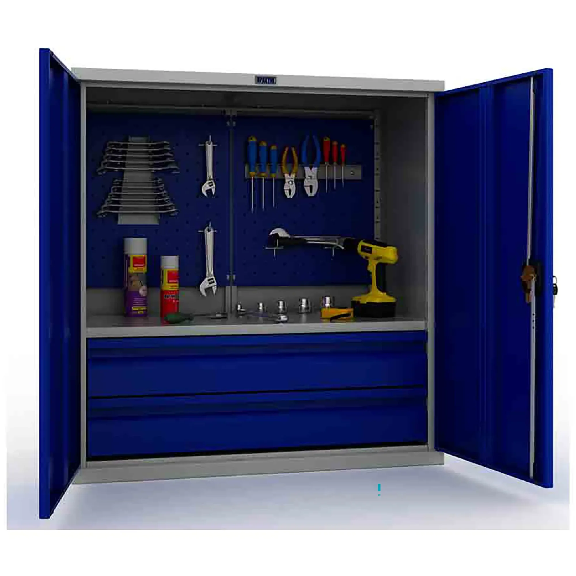 - Надежная защита инструментального парка — цельнометаллический корпус с запирающимися на общий замок дверями обеспечивает высокий уровень безопасности. Это защищает содержимое от краж, несанкционированного доступа, а также от пыли, грязи, стружки и влаги, характерных для производственной среды.