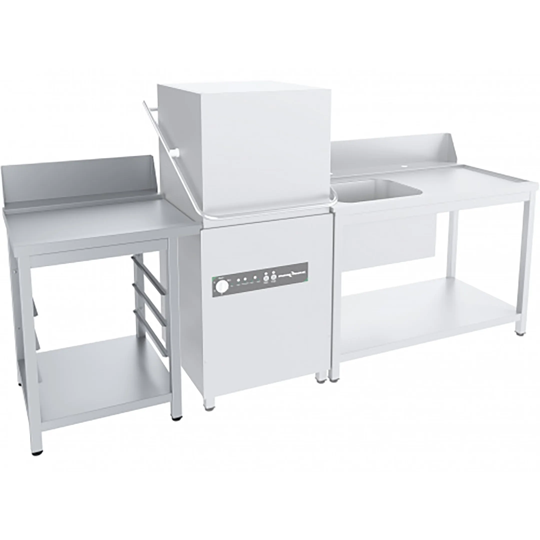 • Стол устанавливается на купольную посудомоечную машину и используется на предприятиях общественного питания в качестве вспомогательного оборудования.