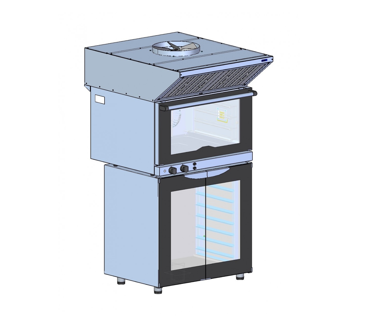 Зонт фиксируется с помощью уголков и болтов М5 к задней стенке конвекционной печи (предварительно нужно совместить трубку вывода пара с приемной трубой зонта и соединить их резиновым патрубком и хомутами).