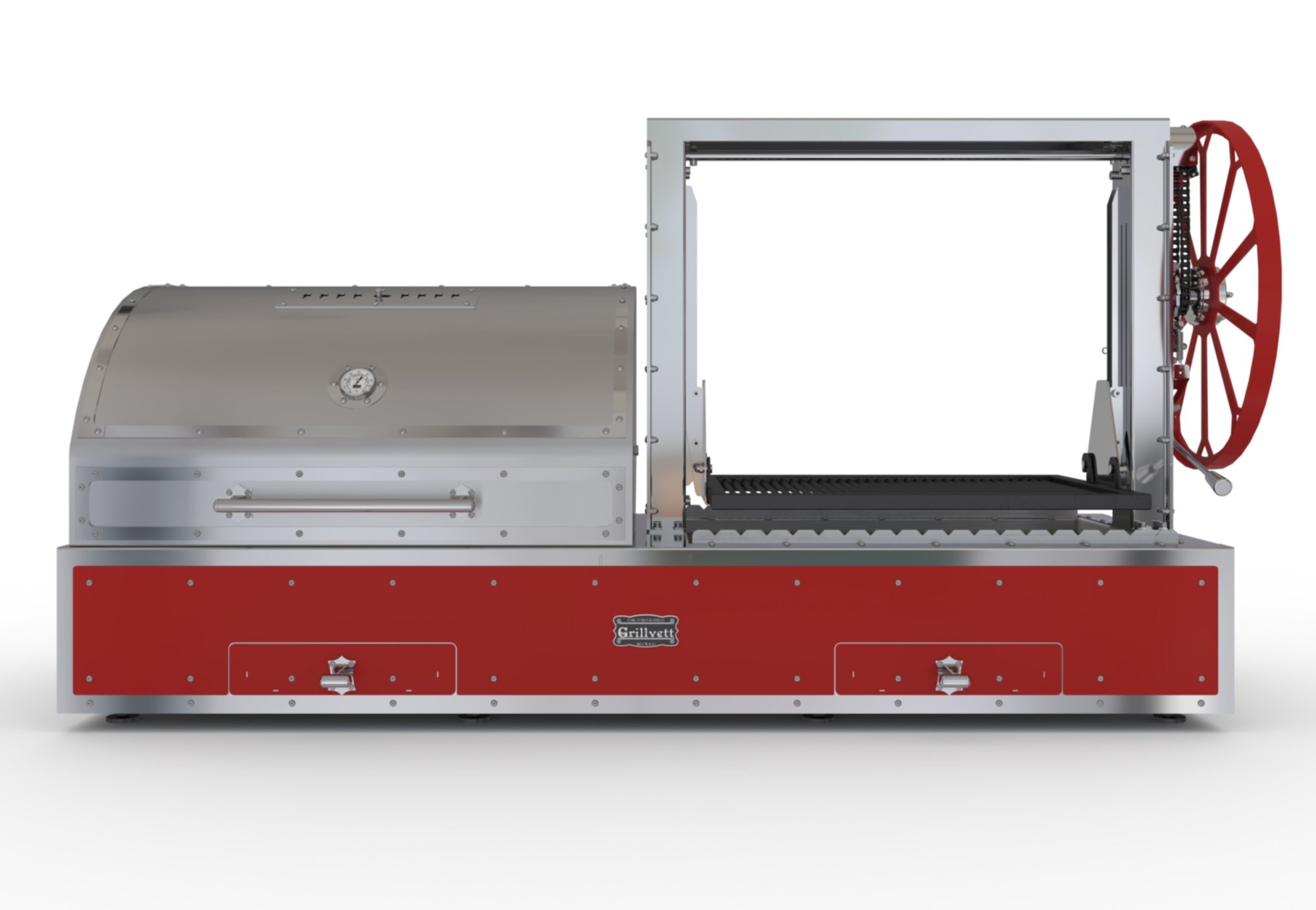- Две рабочие зоны — решетка-гриль с механизмом подъема над очагом и зона копчения/томления с крышкой-смокер.
