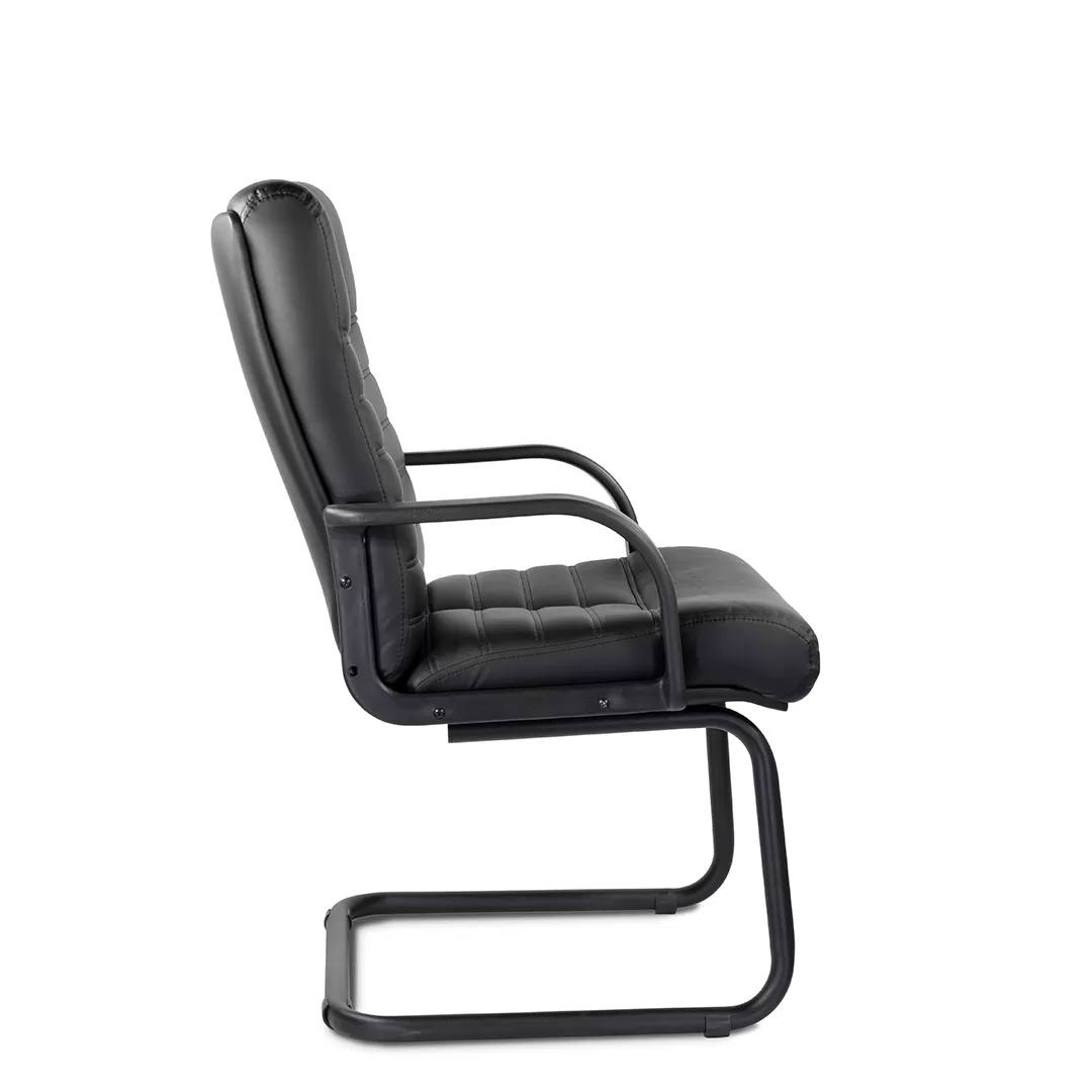 Массивное кресло с горизонтальными прострочками по ширине всей спинки и углублением. Пластиковые подлокотники обеспечат комфортную посадку на весь рабочий день. Модель отлично подойдет для приемной, переговорной в строгом стиле.