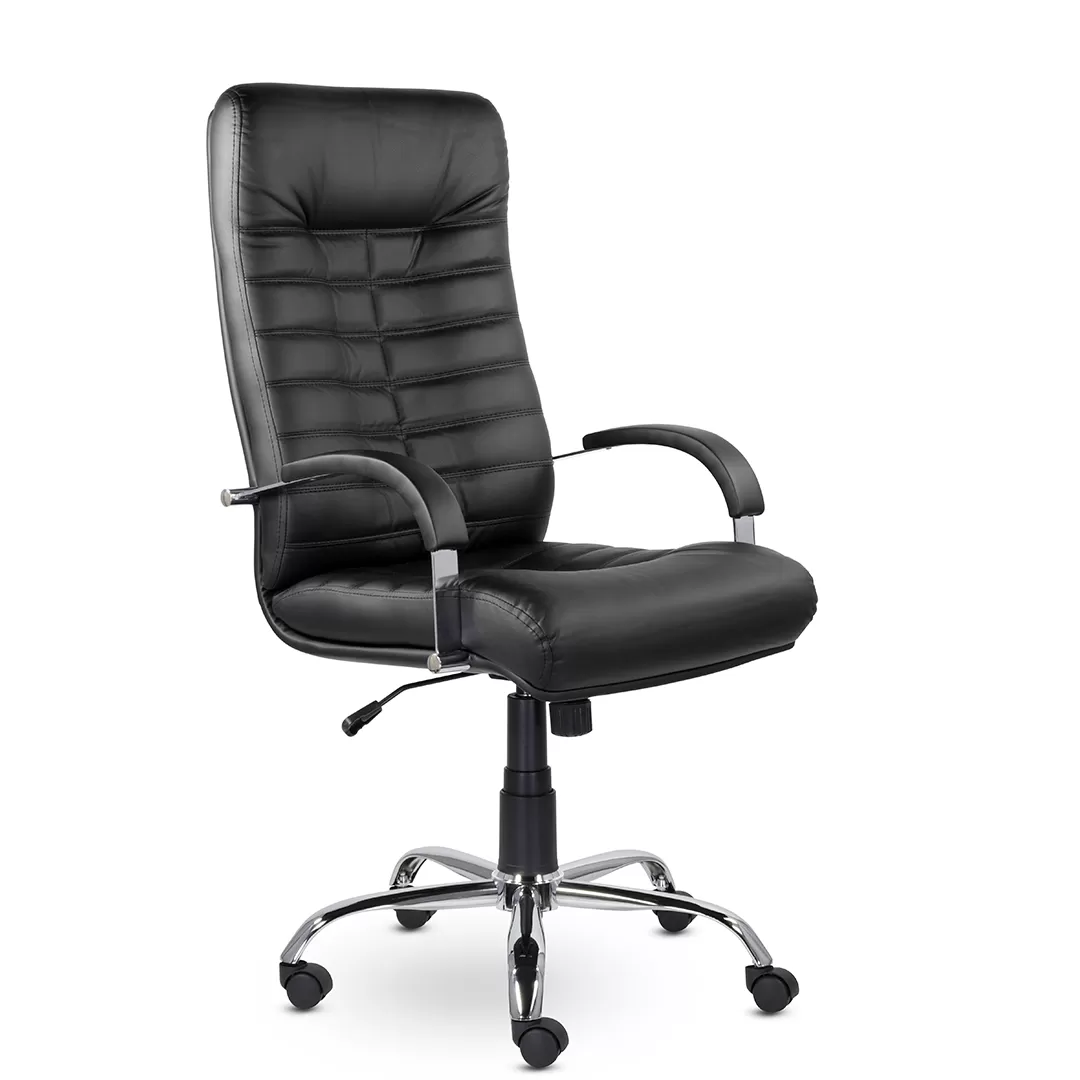 Массивное кресло руководителя оснащено горизонтальными прострочками по всей ширине спинки и хромированными подлокотниками с мягкими накладками. Механизм качания позволяет регулировать высоту сиденья, обеспечивает режим свободного качания и фиксацию каркаса в рабочем положении. Максимальная нагрузка составляет 120 кг.