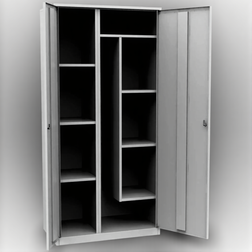 - Универсальность для различных образовательных нужд — модель подходит не только для хранения уборочного инвентаря, но и для организации хранения материалов для творчества, канцелярских принадлежностей, учебных пособий и другого школьного имущества, требующего систематизации.