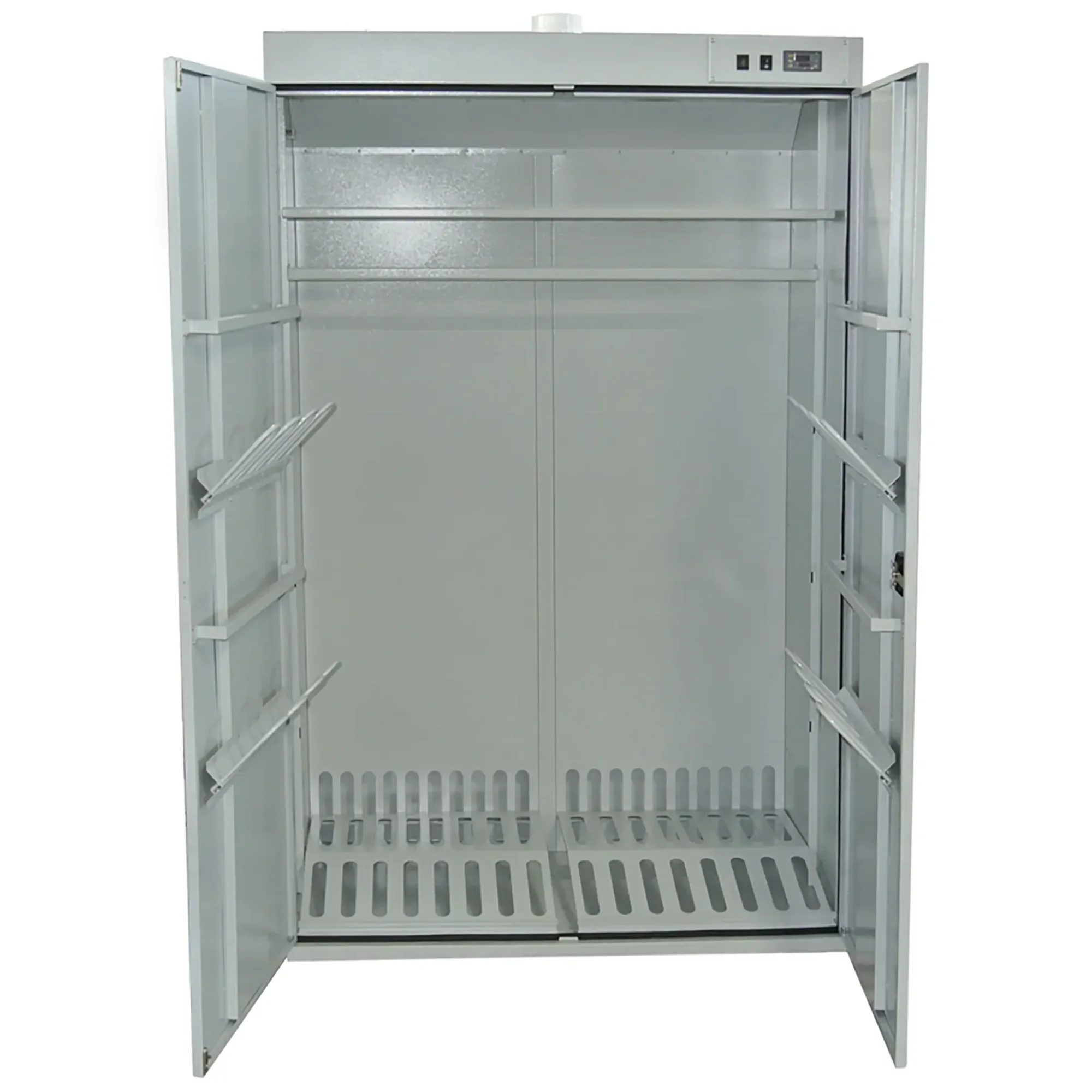- Универсальность и компактность — шкаф предназначен для одновременной сушки как одежды (спецодежды, спортивной формы), так и обуви. Его компактные габариты делают модель идеальной для помещений с ограниченным пространством, таких как небольшие раздевалки, кабинеты персонала или учебные классы.