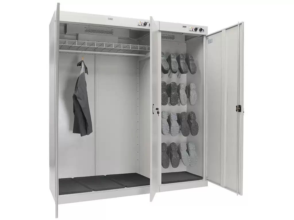 - Высокая производительность и вместимость — шкаф рассчитан на загрузку значительных объемов одежды и обуви за один цикл, что позволяет эффективно обслуживать большие коллективы на предприятиях, в спортивных комплексах или медицинских стационарах.