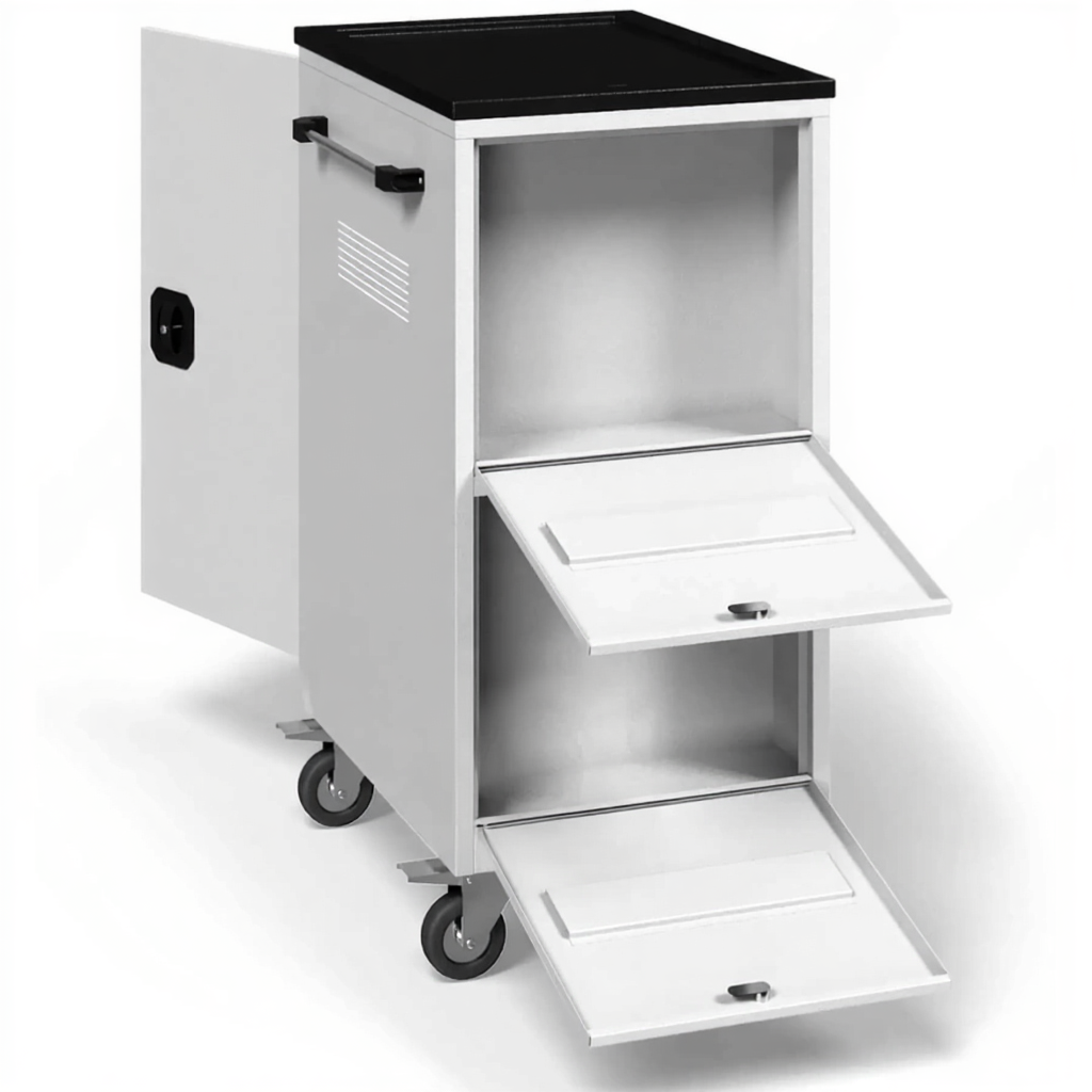 - Мобильность и базовая защита — оснащена колесами для перемещения и, как правило, защитным каркасом или бортами, который предотвращает падение ноутбуков во время движения. Часто имеет общий замок для ограничения доступа.