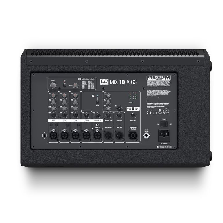 Возможно подключение широкого спектра источников входного сигнала, включая электромузыкальные инструменты, смартфоны, планшеты, MP3 и CD-плееры. Встроенный микшер оснащен 3 микрофонными каналами с 2-полосным эквалайзером и фантомным питанием 48 В. Выходная секция включает в себя 3-полосный мастер-эквалайзер для общей корректировки тона, 4-сегментный светодиодный индикатор и выходы XLR для монитора и сабвуфера. Кроме того, MIX 10 A G3 оснащен DSP с 16 пресетами цифровых эффектов, лимитером и системой защиты от перегрузки по току и короткого замыкания. Выход SpeakON позволяет подключать дополнительную пассивную систему MIX 10 G3. Прочный корпус изготовлен из фанеры с углом 50° для использования в качестве сценического монитора и «стаканом» под стойку с наклоном 0° или 5°. MIX 10 A G3 обеспечивает высокую производительность и универсальность применения в легком корпусе.